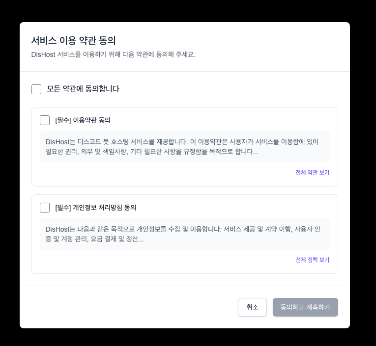 소셜 로그인 인증이 완료되면 디스호스트의 서비스 이용 약관 페이지로 이동합니다. 이 단계는 최초 로그인 시에만 표시됩니다.