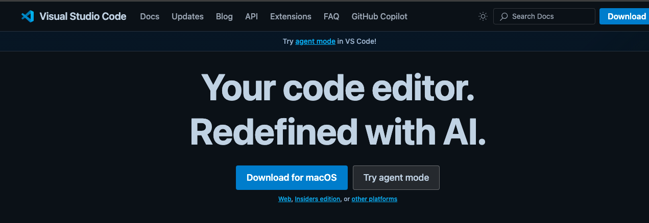 VS Code 공식 홈페이지에서 본인 운영체제에 맞는 설치 파일을 받아 설치하면 됩니다.
