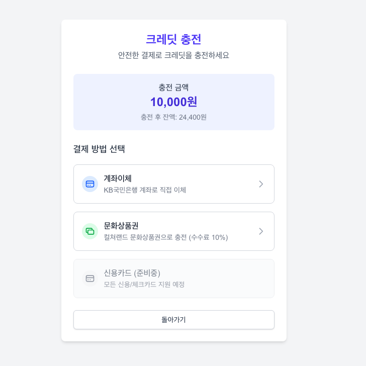 이 페이지에서는 다양한 금액의 크레딧 충전 옵션과 충전 방법을 선택할 수 있습니다.